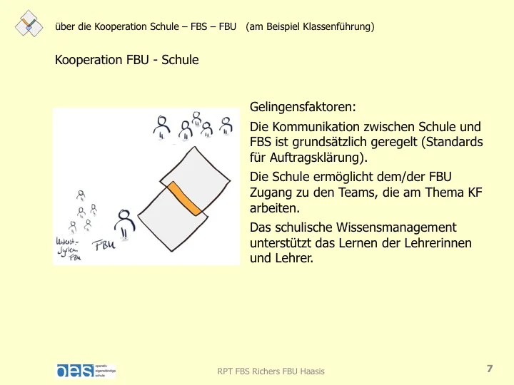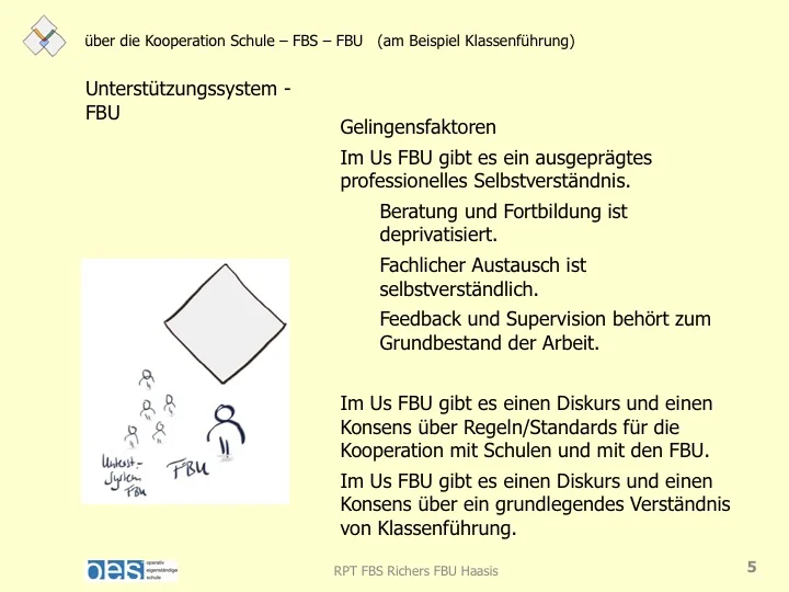 Der FBU macht gegenüber der Schule deutlich, dass ohne Kooperation im Klassenteam kein Aufbau und keine Pflege einer wirksamen Klassenführung möglich ist. Hierzu betont er die Expertise und Perspektive der FBS. Er empfiehlt der Schule, eine FBS einzubeziehen und arbeitet mit dieser FBS zusammen.