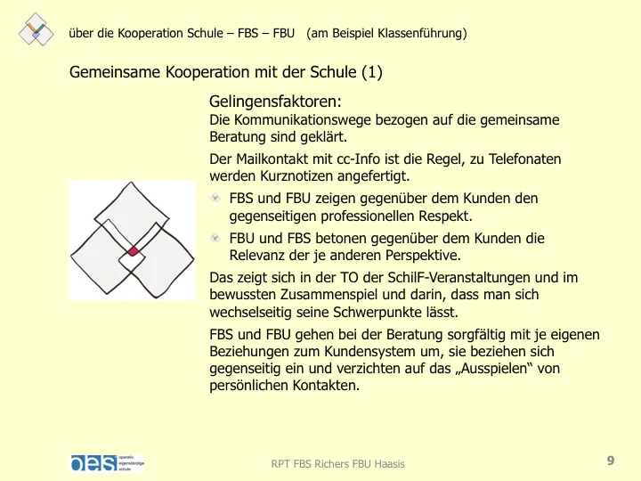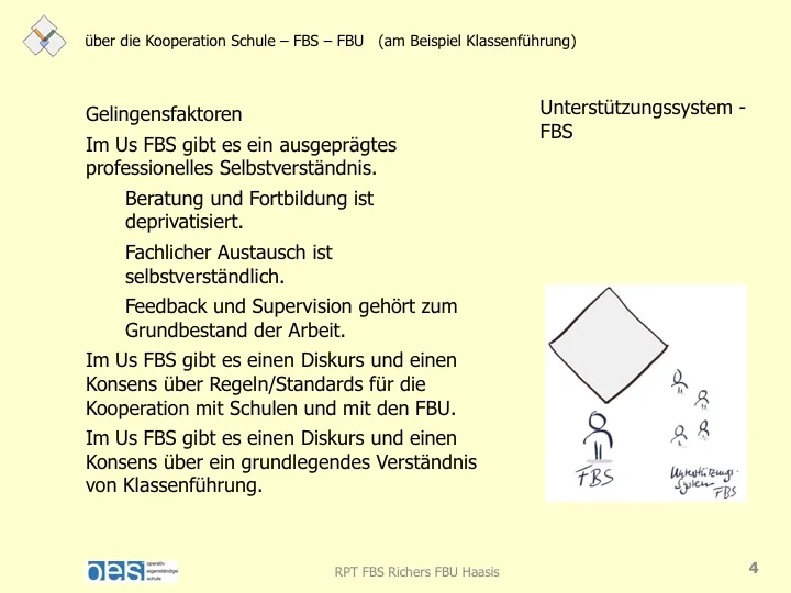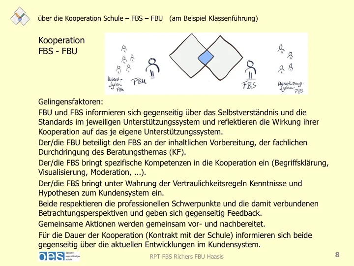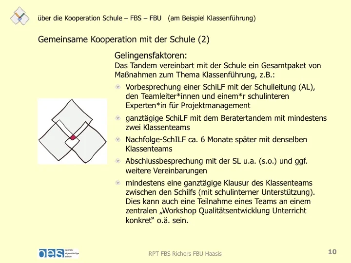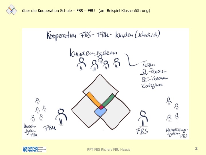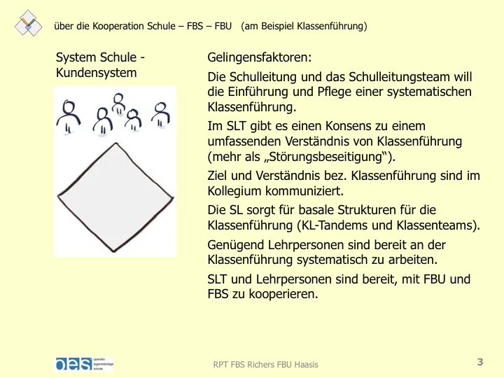 Die inhaltliche Basis für das Thema “Klassenführung” bildet die Handreichung Klassenführung mit allen ihren Stärken und Mängeln. Diese ist aus meiner Sicht eher “regel-lastig” und gibt zu wenig Auskunft über die Chancen und Klippen der kollegiale Kooperation. Vor allem aber enthält sie keine Graphiken zum Thema Klassenführung, die als Verständigungsinstrumente für alle drei Seiten (Schule, FBS, FBU) geeignet wären. Am RPT haben wir versucht, diese Lücke zu schließen.
