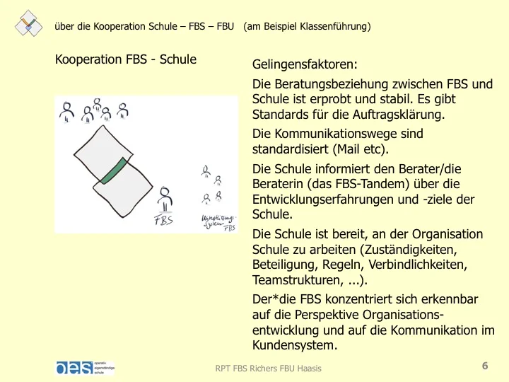 Die FBS macht gegenüber der Schule deutlich, was ihr eigener Beitrag zum Thema Klassenführung ist (organisatorische Einbindung, Kooperation im Team, Vorschläge zur Visualisierung und Dokumentation und Reflexion, Einbindung der Klassenführung in den Gesamtkontext der Schul- und Unterrichtsentwicklung).