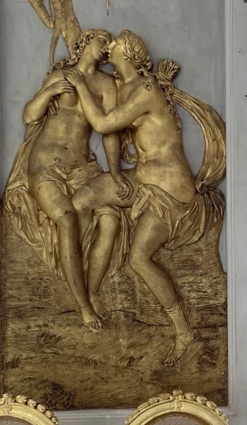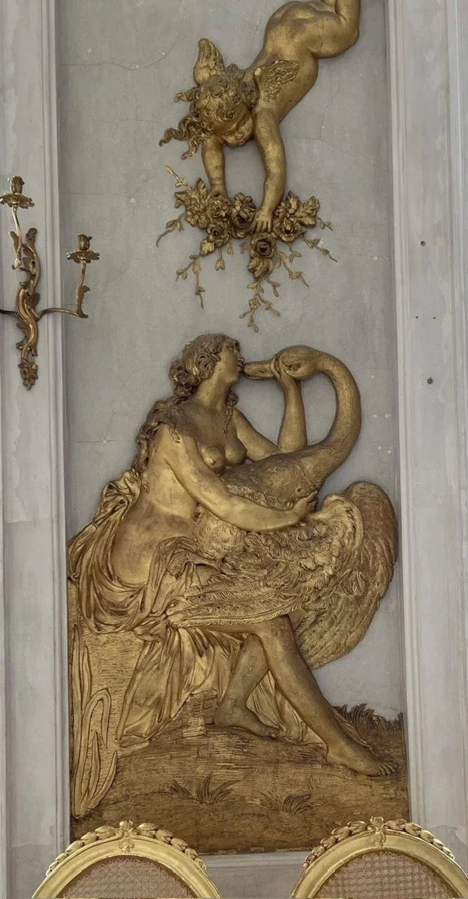 Friedrich der Große mag ähnlich gedacht haben. Es ist der Speise- und Festsaal für seine Gäste. Er wollte sie wohl nicht nur mit edlen Speisen sondern auch mit schönen Anregungen zu gebildeten Gesprächen erfreuen. „Wer erzählt uns die Geschichte zum Bild?“ Frivoles in heiterer Runde.