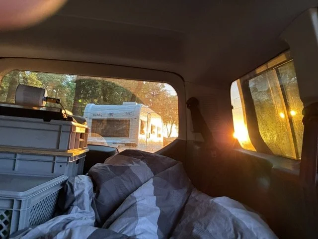 Eine Nacht im Bus, der anstelle des Zeltes mit dem Heck an das Vorzelt andockt. So gemütlich, dass der Gedanke aufkommt: Wozu das Zelt? Nein, im Zelt ist es viel geräumiger. Der Bus punktet v.a. durch das Oberlicht, bei Regen jedoch ist die Kombination Zelt und Vorzelt viel besser. Und viel schöner.
