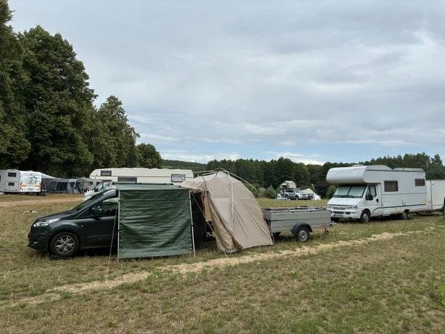 Der Tag ist wider Erwarten noch mal sehr heiß, das verlangsamt alles. Wieder eine Siesta am Waldrand. Der Platz ist nun sehr belebt, wenn auch immer noch nicht ausgebucht. Eine Gruppe, 4 Kinder dabei, lagert, spielt, lacht und brabbelt direkt vor meiner Nase. Ich weiche hinters Auto aus, das geht. Dort, im Abendlicht, ist auch ein schöner Sitz- und Schreib-Platz, und sie gehen zum Grillen in das Vereinszelt am Rande des Platzes.