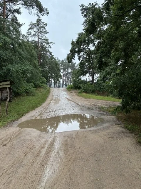 In ein paar Minuten sind wir da. Im Wald, an einem kleinen See, offensichtlich ein Badesee, von Seerosen schon fast überwachsen. Wahrschienlich sind die Eigentümer gerade überfordert, niemand da zum Anmelden, die Schranke offen.