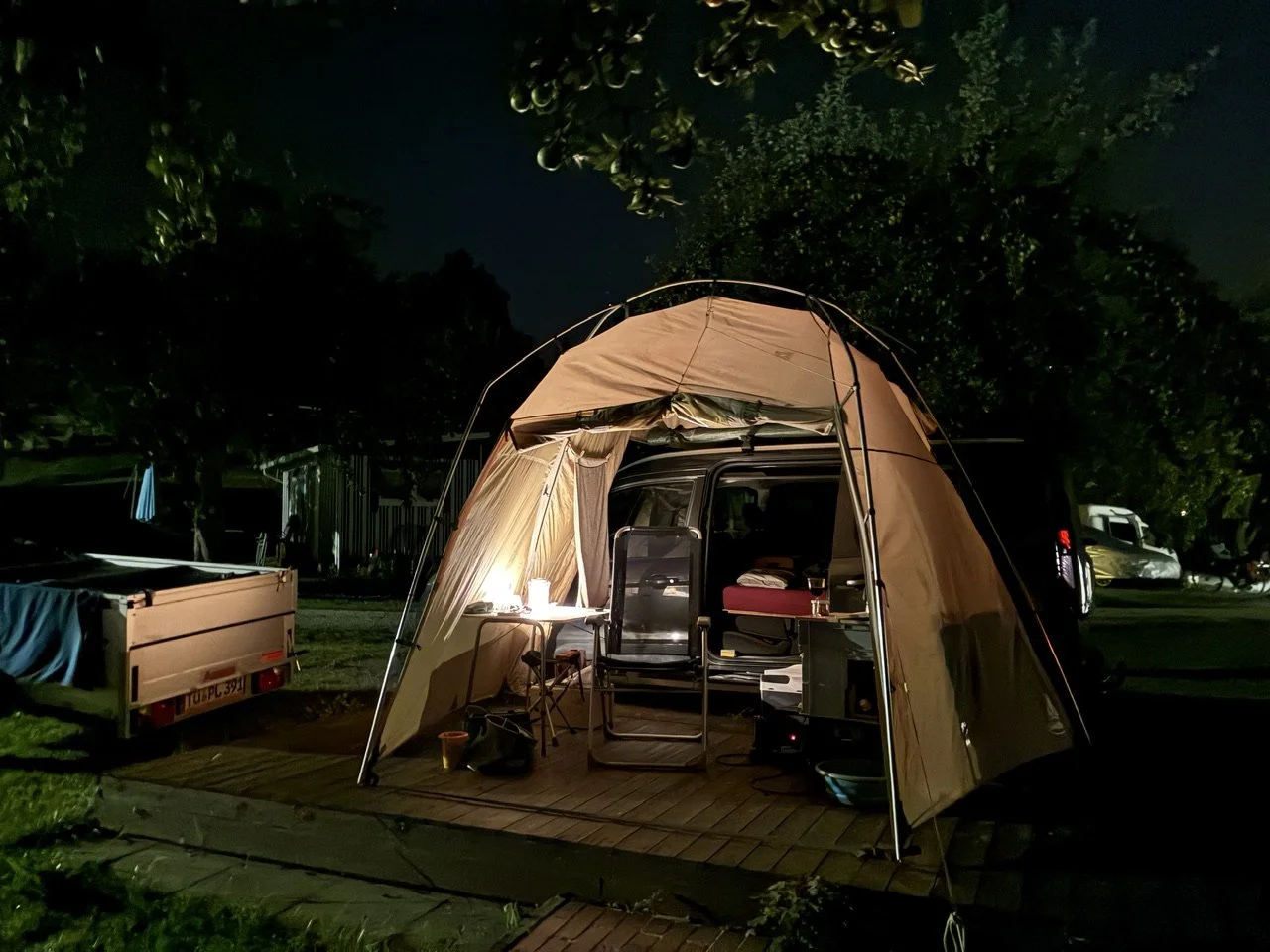 Auto mit Vorzelt an der Seite, erstmalig, statt am Heck: prima.