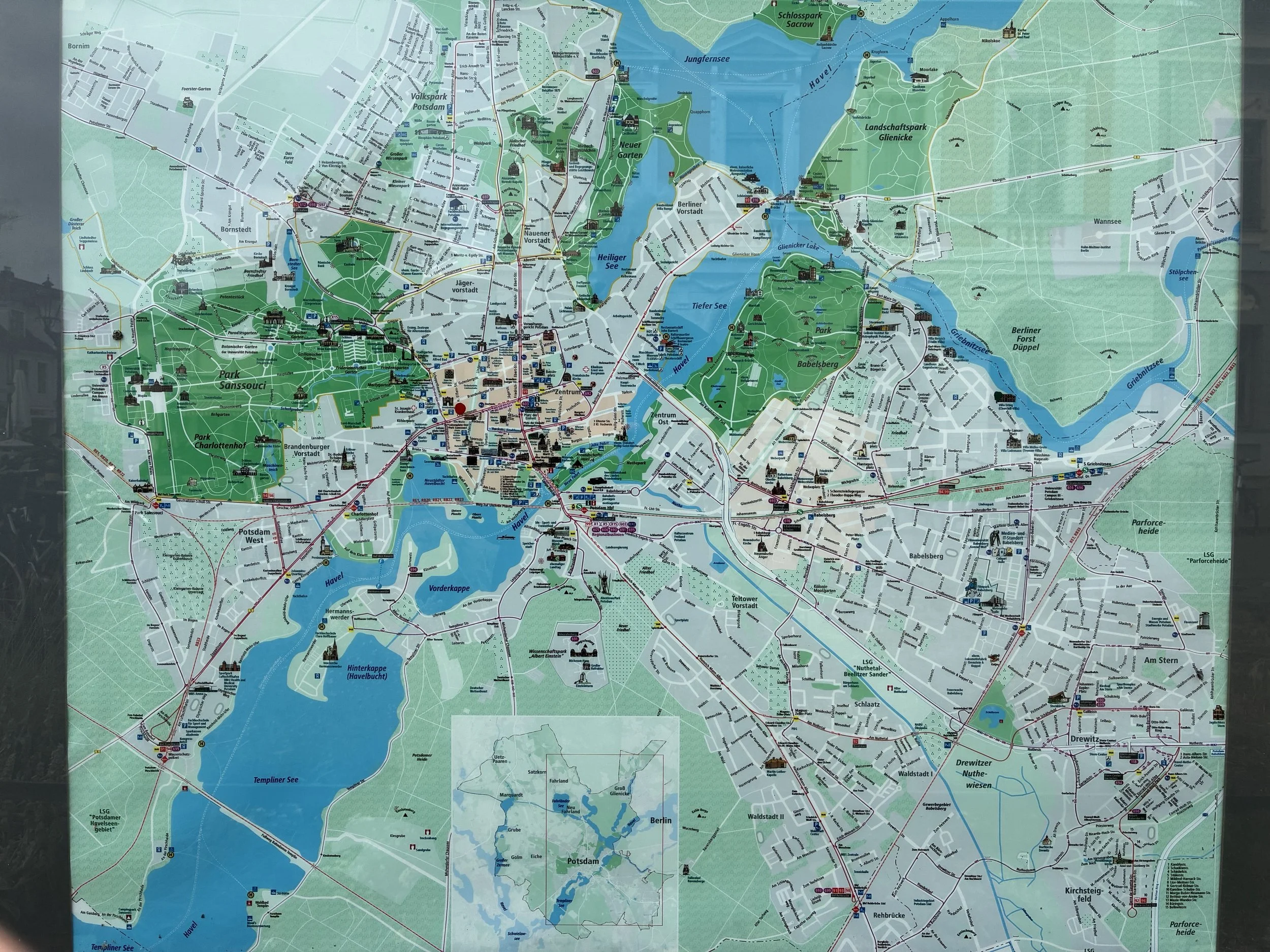 Zum ersten Mal im Zentrum von Potsdam, sehr übersichtlich, nahezu rechtwinklig angelegte Straßen, die Hausnummern-Folge allerdings gewöhnungsbedürftig. rechts 1-50, links 51-100 (z.B.), das funktioniert wohl nur, wenn auf begrenztem Platz alle Grundstücke von Anfang an nummeriert werden. Potsdam ist eine Insel.